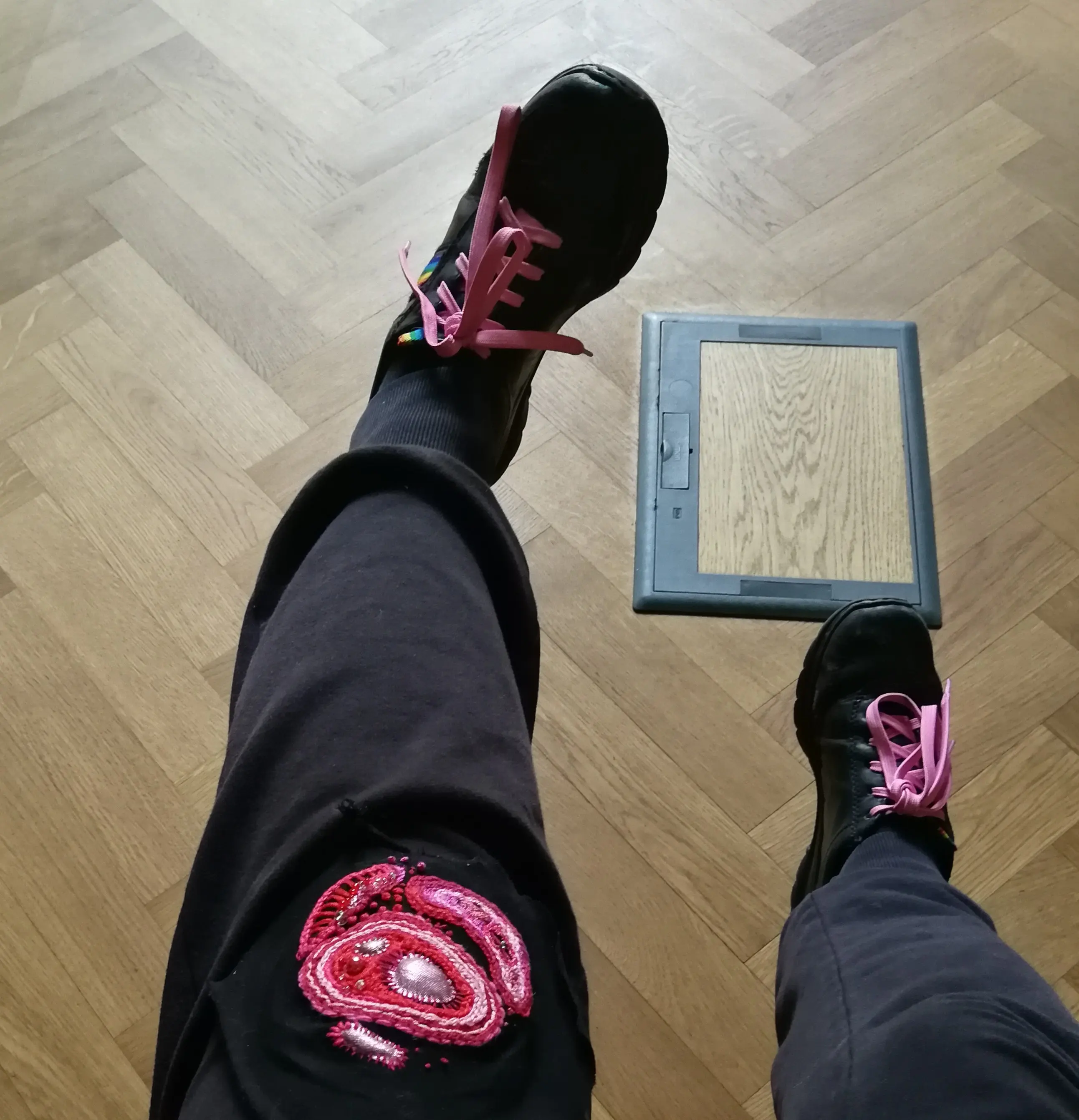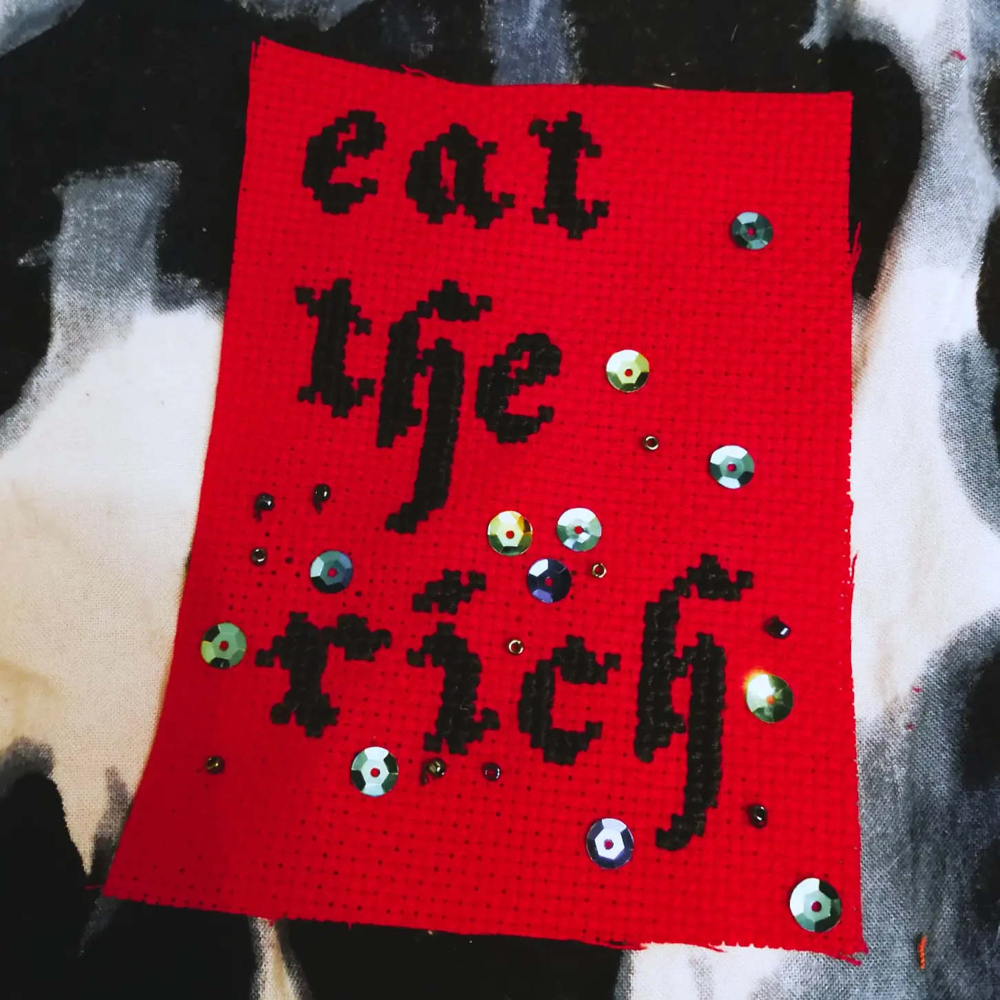 kolaż z plamą emulsji po cyjanotypii, błyszczącymi elementami i pieczątką biblioteki miejskiej, 2025
